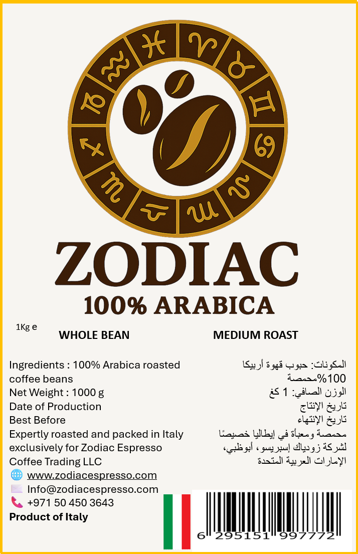 Crafted in Italy with premium Arabica beans sourced from South America, Zodiac Espresso delivers a smooth, aromatic cup with rich notes of dark chocolate, toasted nuts, and a clean, balanced finish. Expertly roasted in a traditional Italian roastery, each bean embodies the perfect harmony of origin and craftsmanship.